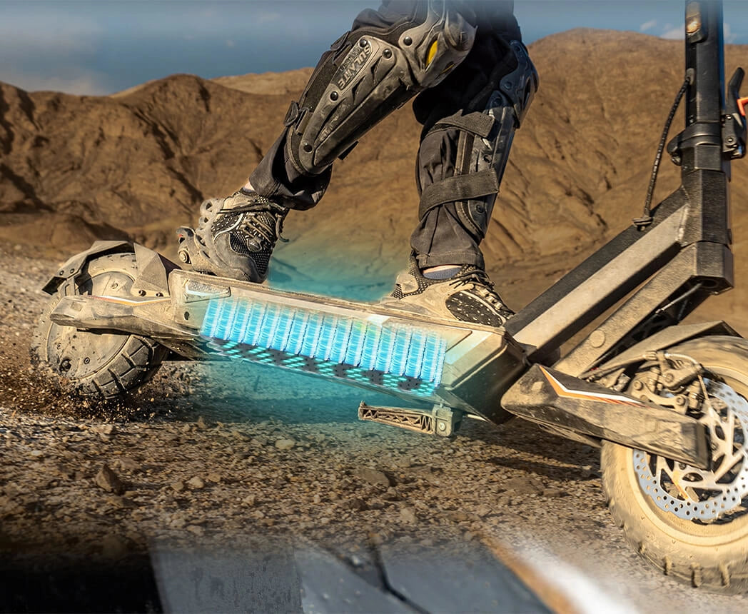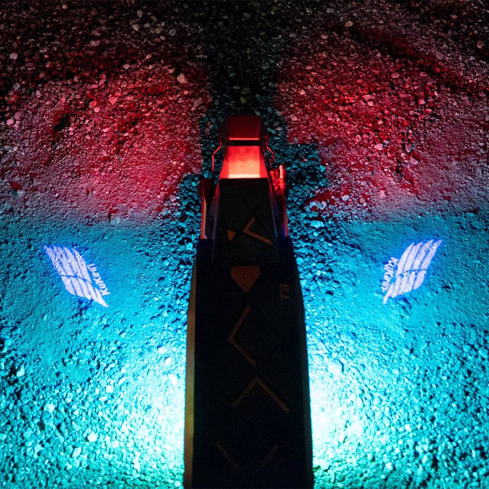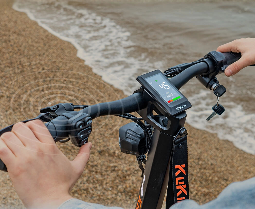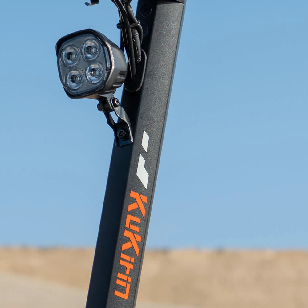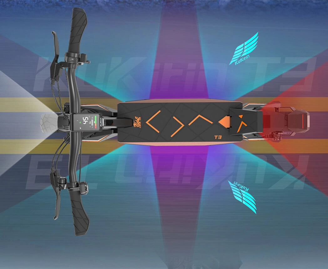 El KuKirin T3 asegura una máxima visibilidad y seguridad con un sistema de 14 luces completo. Incluye 1 faro potente, 2 luces láser, 4 señales de giro delanteras, 4 luces ambientales estáticas, 2 luces de posición multicolor RGB, 1 luz de freno de cola, 2 reflectores de asta y 1 reflector posterior, ofreciendo una iluminación completa de 360° para recorridos nocturnos más seguros.
